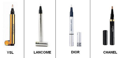 Todos son pinceles iluminadores que se aplican en la zona de las ojeras y en alguna otra zona que se quiera iluminar. El primero de ellos es el famosísimo ‘Touche Eclat’ de YSL, y por lo que yo recuerdo fue el primero que salió al mercado, tuvo mucho éxito y después fueron sacando clones la mayoría de las marcas. En la foto he puesto sólo algunos de ellos: Flash Retouche de Lancôme, Skin Flash de Dior y Eclat Lumiere de Chanel. Tiene muchos más clones, algunos más económicos son: L’Oréal y Bourjois.
